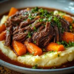 This pot roast pairs beautifully with sides that complement its rich flavors. Serve it over creamy polenta or buttery mashed potatoes to soak up every drop of sauce. Thick slices of crusty bread or freshly made garlic bread are perfect for dipping, while a light, fresh salad dressed in vinaigrette can balance the meal’s richness.